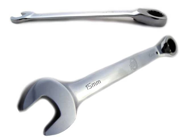 Een 15 mm steeksleutel aan de ene kant en een 2-zijdige 15 mm ratelsteeksleutel aan de andere kant. Het is lang genoeg om een goede hefboomwerking te hebben en toch gemakkelijk op te bergen in de zak.